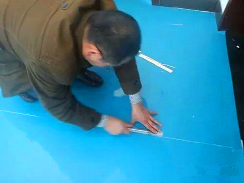 2、PVC塑胶运动地板在铺设之前,必须提前展开平铺在铺设地面24小时以上, 且现场温度不应低于15℃。地板还原后,切割时两端应多留125px。粘贴前,将展开的地板反向卷起约一半,然后刮胶铺设—从中间开始—胶水用带齿的刮刀进行施工。