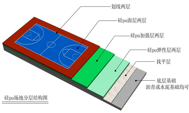 精巧设计的面硬里软三层复合结构硅PU球场材料,形成科学运动安全保障体系,既有效保护运动受伤同时又满足震动吸收和反弹的要求。